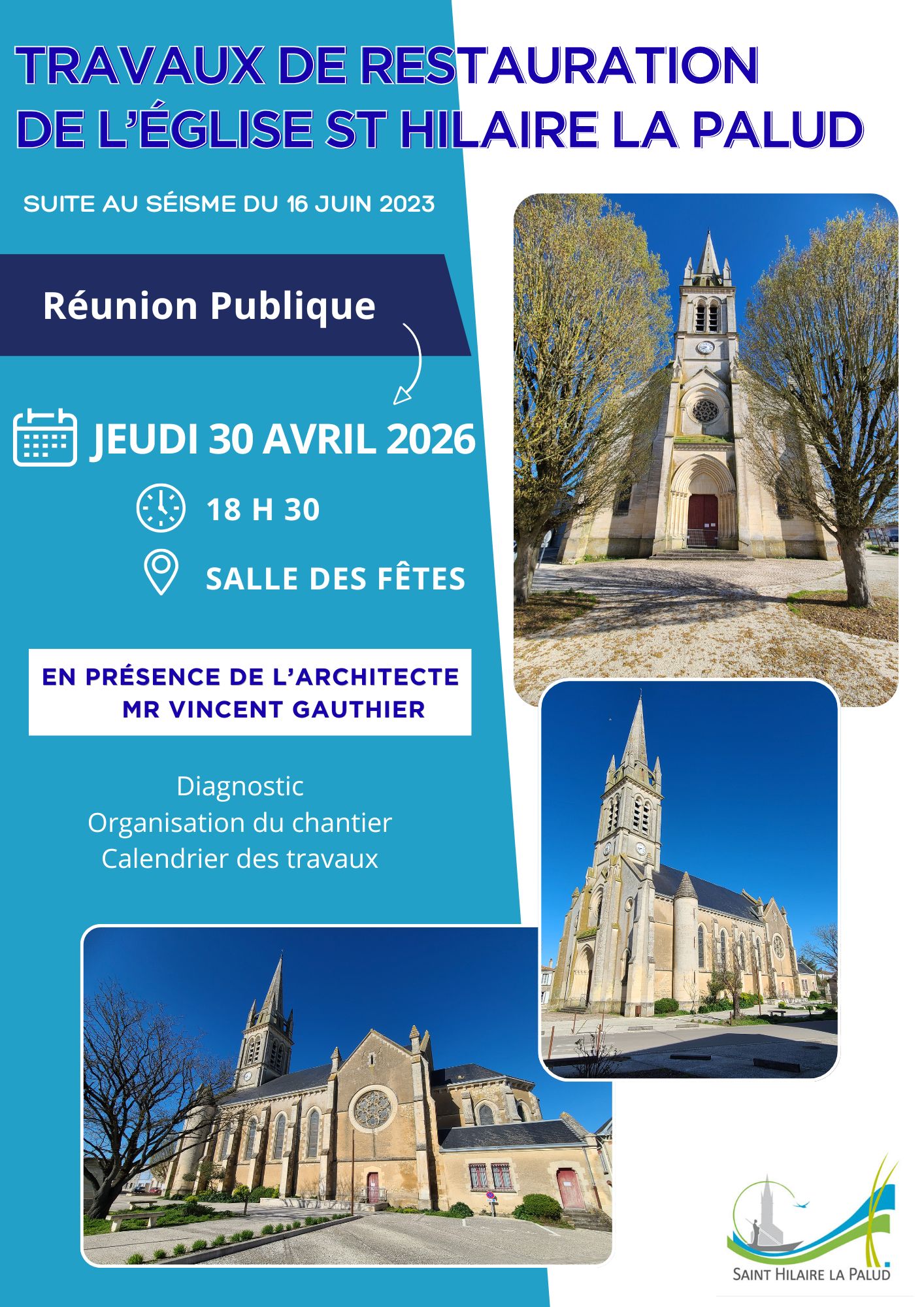 Dans le cadre des travaux de restauration de l’Église, engagés suite au séisme du 16 juin 2023, l’équipe municipale a le plaisir de vous inviter à une réunion publique d’information.